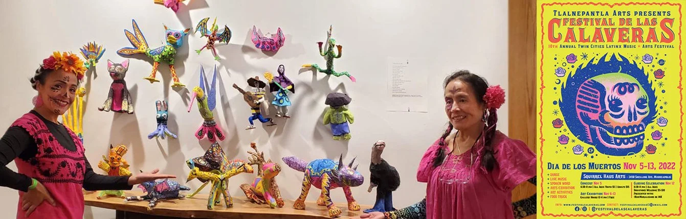 The Alebrijes created by Gustavo, Aaron and the workshop participants were exhibited at Squirrel House Arts, on November 12th during the Festival de las Calaveras annual arts festival for Día de los Muertos.