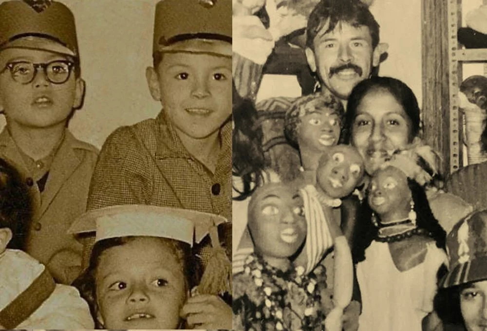 Left photo: Gustavo, age eight (upper right) with his siblings. Right photo: Gustavo as an adult at one of his early puppet shows.