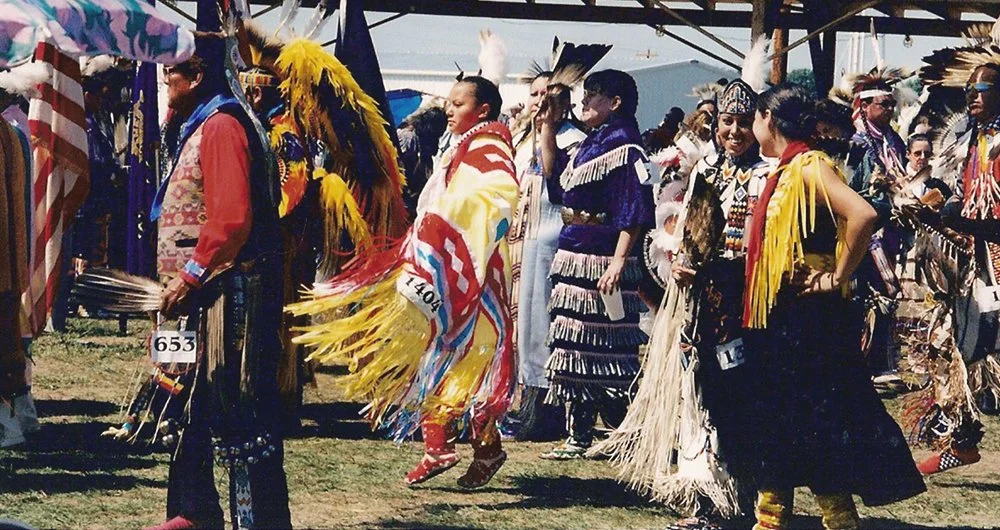 Photo: Oogie (center) dancing Fancy Shawl at a Pow-wow.